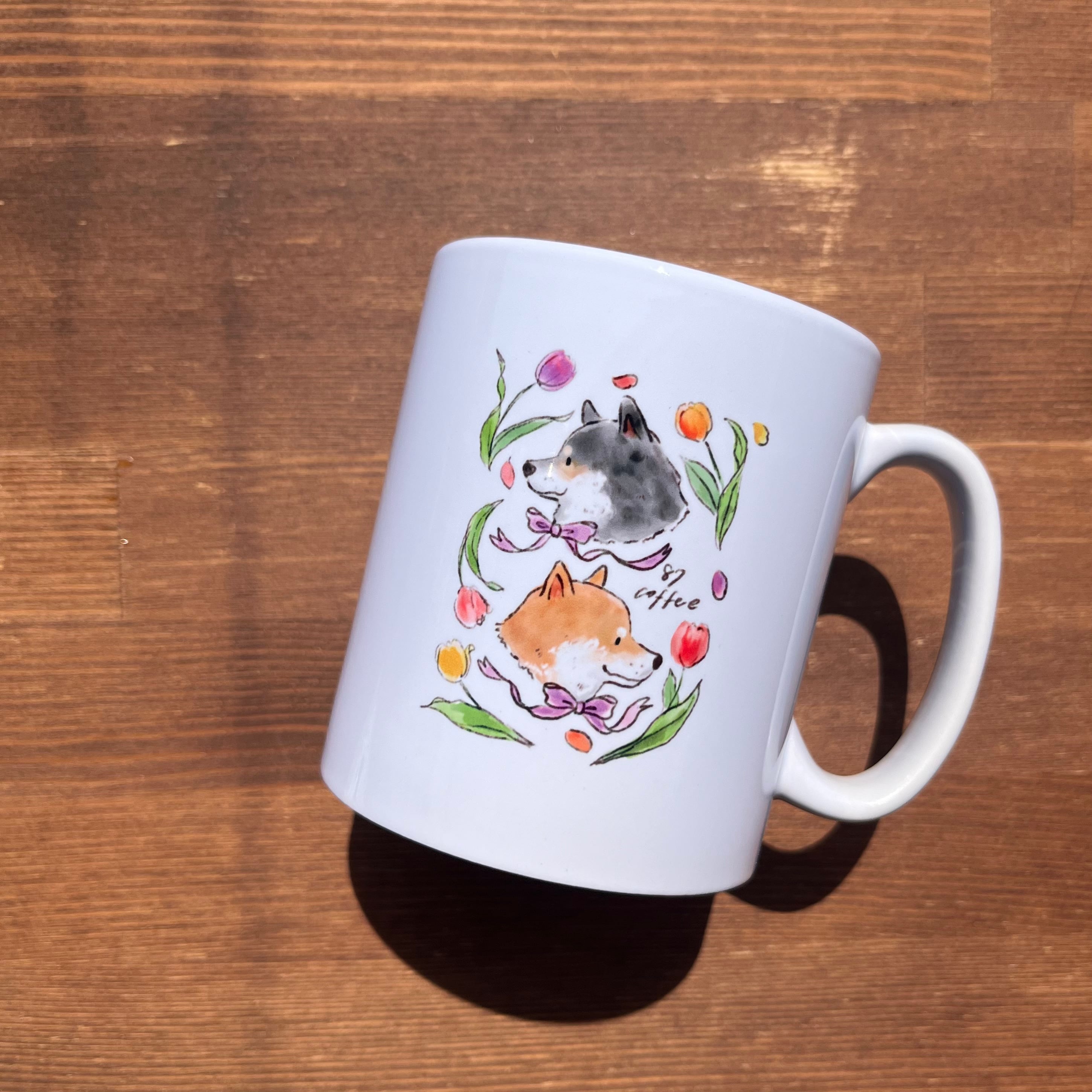 数量限定スプリングverの、赤柴ろく、黒柴はなが描かれたマグカップです^^