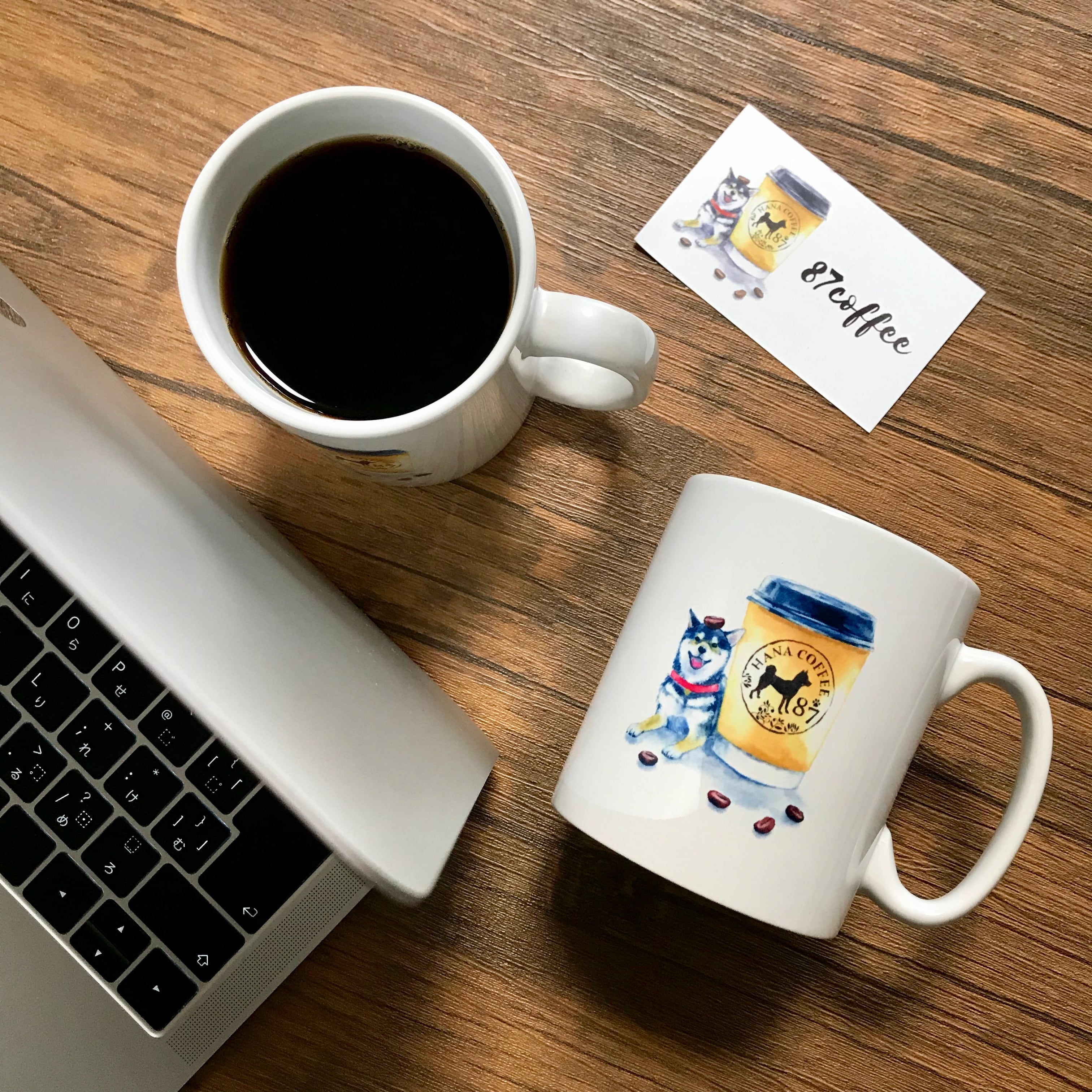 87coffeeの看板犬、黒柴はな、赤柴ろくが描かれたマグカップです^^